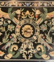 Rare polychrome scagliola tabletop depicting Baroque festoons, parrots and peacocks with the heraldic shield in the center.