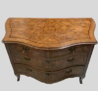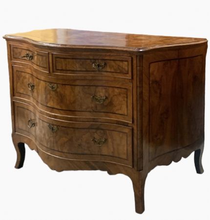 Chest of drawers curved on the front and sides, entirely veneered in walnut and walnut burl, stringed with bois de rose. Period: Mid-18th century. Area of origin: Veneto. Dimensions: 125 X 60 H 88.