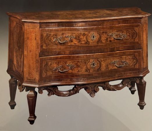 An der Vorderseite zwei Schubladen in einer Linie und am Boden eine geschnitzte und geformte Schürze.