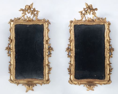 Paar Spiegel mit fein geschnitztem und vergoldetem Holzrahmen, Venedig, zweite Hälfte des 18. Jahrhunderts Abmessungen: 93 X 83 cm.