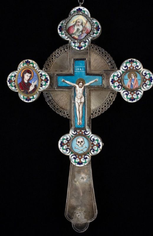 Rara croce astile in argento e smalti.